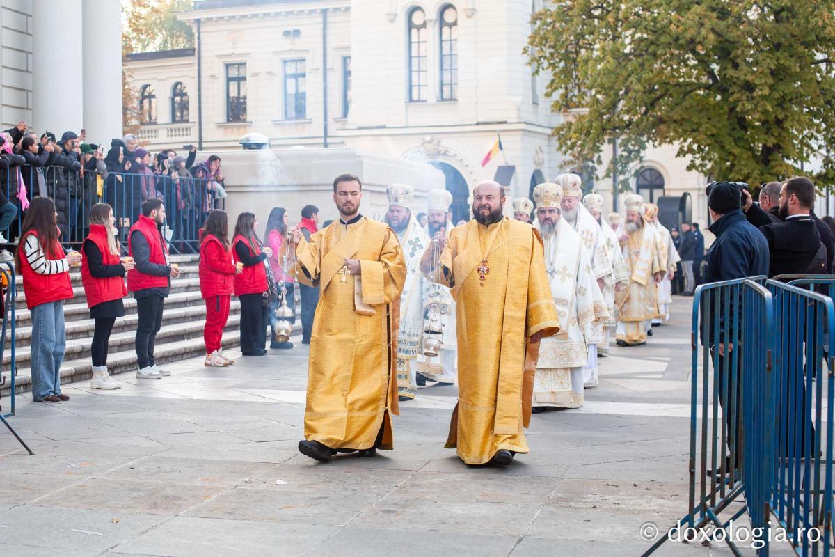 La Sfânta Liturghie prilejuită de hramul Sfintei Cuvioase Parascheva de la Iași slujește un sobor de ierarhi, preoți și diaconi, în frunte cu Înaltpreasfințitul Părinte Teofan, Arhiepiscopul Iașilor și Mitropolitul Moldovei și Bucovinei.